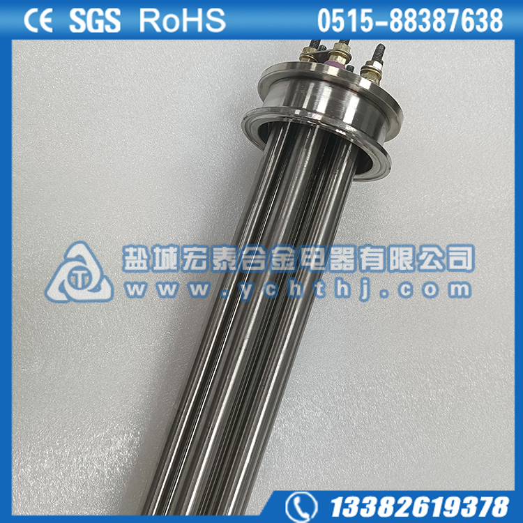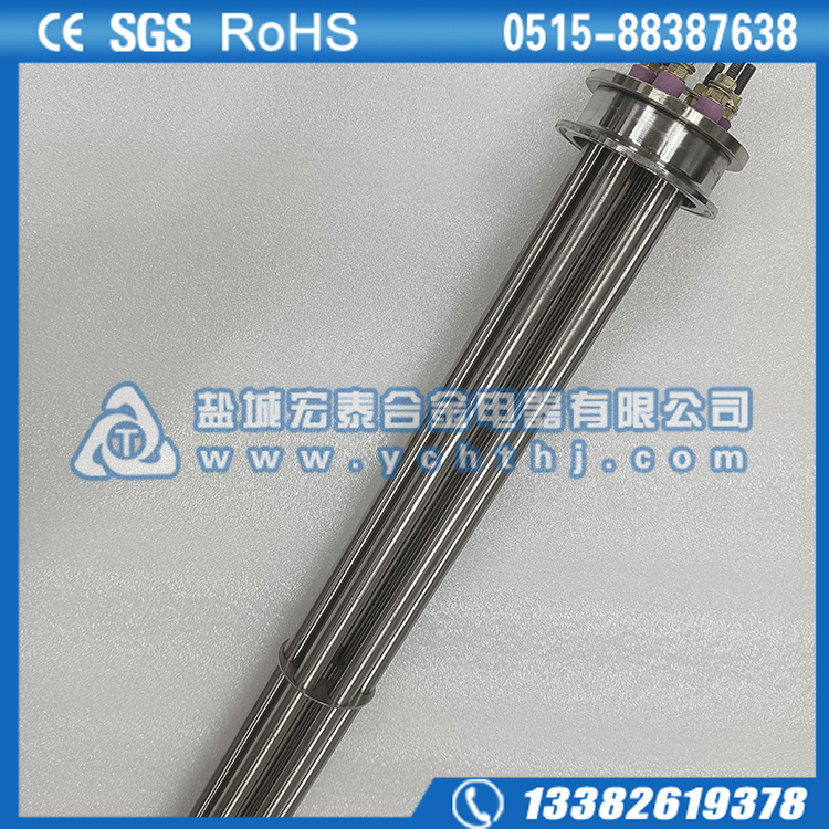 法兰电加热管(也称插入式电加热器):是采用U型管状电热元件,依据加热不同介质设计规范,按照功率配置要求装配在法兰盖上,插入需加热物料中,发热元件工作时所发出的大量热量传导给被加热介质使介质温度升高,达到所需的工艺要求。当介质温度达到工艺要求的设定值时,控制系统根据温度传感器信号,经PID运算后调节电加热器输出功率,对发热元件的电阻性负载实现温度控制。使介质温度均匀,达到所需要求;当发热元件超温或低液位时,发热元件的联锁保护装置立即切断加热电源避免发热元件烧坏,延长使用寿命。