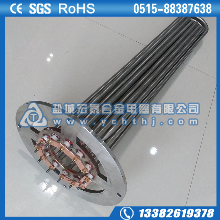 法兰电加热管(也称插入式电加热器):是采用U型管状电热元件,依据加热不同介质设计规范,按照功率配置要求装配在法兰盖上,插入需加热物料中,发热元件工作时所发出的大量热量传导给被加热介质使介质温度升高,达到所需的工艺要求。当介质温度达到工艺要求的设定值时,控制系统根据温度传感器信号,经PID运算后调节电加热器输出功率,对发热元件的电阻性负载实现温度控制。使介质温度均匀,达到所需要求;当发热元件超温或低液位时,发热元件的联锁保护装置立即切断加热电源避免发热元件烧坏,延长使用寿命。