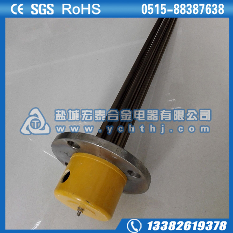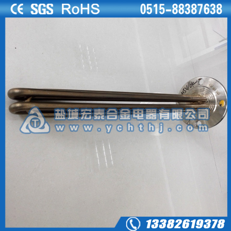 法兰电加热管(也称插入式电加热器):是采用U型管状电热元件,依据加热不同介质设计规范,按照功率配置要求装配在法兰盖上,插入需加热物料中,发热元件工作时所发出的大量热量传导给被加热介质使介质温度升高,达到所需的工艺要求。当介质温度达到工艺要求的设定值时,控制系统根据温度传感器信号,经PID运算后调节电加热器输出功率,对发热元件的电阻性负载实现温度控制。使介质温度均匀,达到所需要求;当发热元件超温或低液位时,发热元件的联锁保护装置立即切断加热电源避免发热元件烧坏,延长使用寿命。