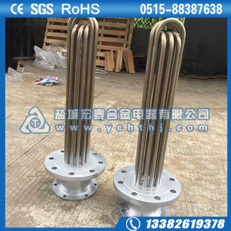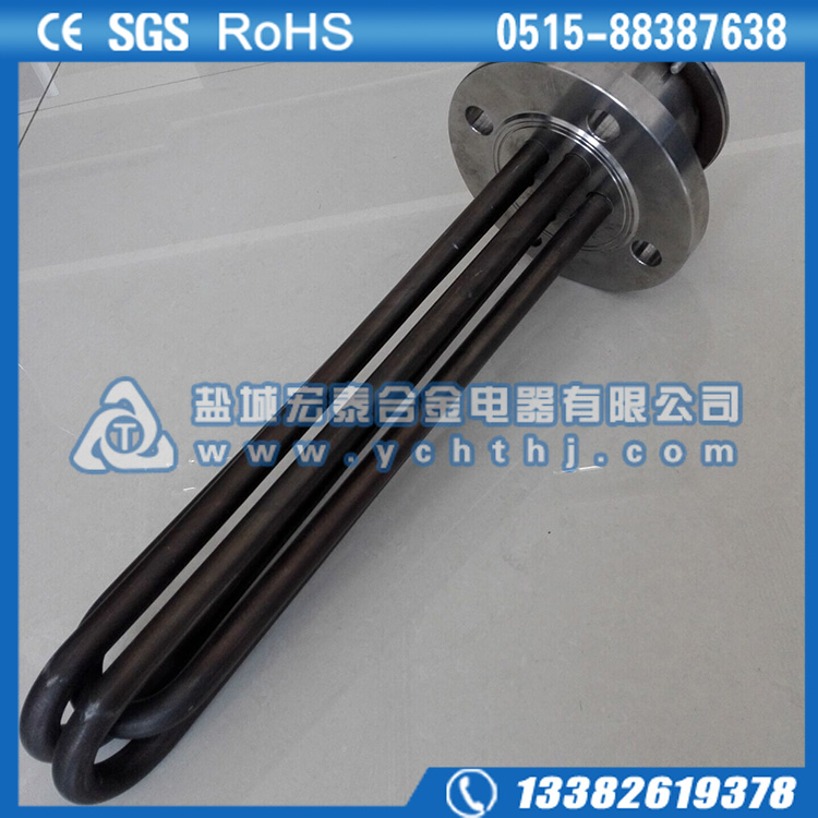 法兰电加热管(也称插入式电加热器):是采用U型管状电热元件,依据加热不同介质设计规范,按照功率配置要求装配在法兰盖上,插入需加热物料中,发热元件工作时所发出的大量热量传导给被加热介质使介质温度升高,达到所需的工艺要求。当介质温度达到工艺要求的设定值时,控制系统根据温度传感器信号,经PID运算后调节电加热器输出功率,对发热元件的电阻性负载实现温度控制。使介质温度均匀,达到所需要求;当发热元件超温或低液位时,发热元件的联锁保护装置立即切断加热电源避免发热元件烧坏,延长使用寿命。