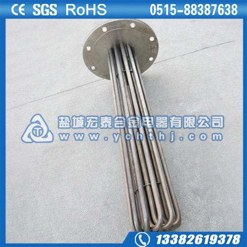 法兰电加热管(也称插入式电加热器):是采用U型管状电热元件,依据加热不同介质设计规范,按照功率配置要求装配在法兰盖上,插入需加热物料中,发热元件工作时所发出的大量热量传导给被加热介质使介质温度升高,达到所需的工艺要求。当介质温度达到工艺要求的设定值时,控制系统根据温度传感器信号,经PID运算后调节电加热器输出功率,对发热元件的电阻性负载实现温度控制。使介质温度均匀,达到所需要求;当发热元件超温或低液位时,发热元件的联锁保护装置立即切断加热电源避免发热元件烧坏,延长使用寿命。