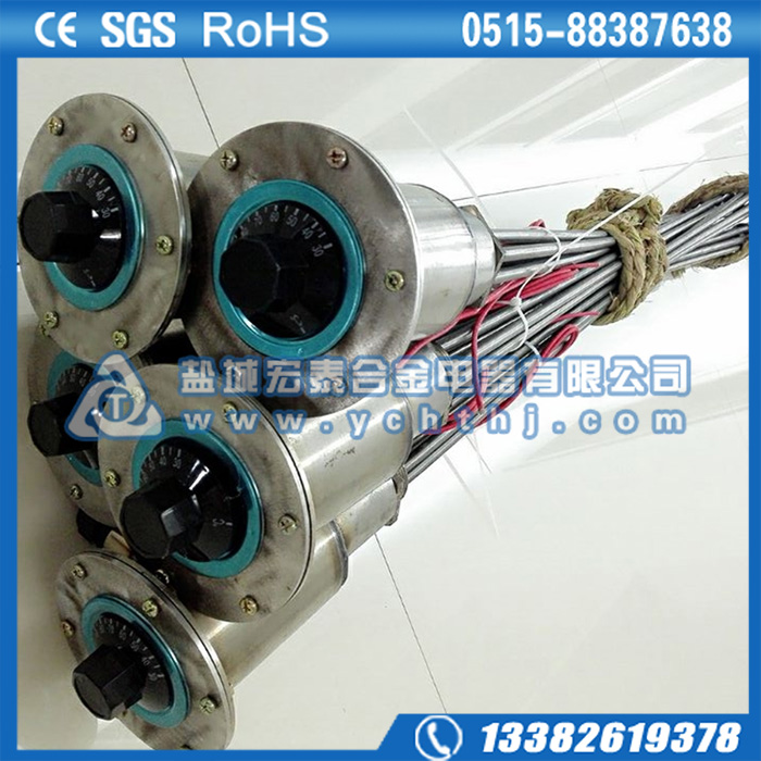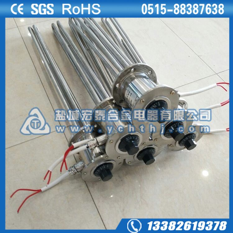 法兰电加热管(也称插入式电加热器):是采用U型管状电热元件,依据加热不同介质设计规范,按照功率配置要求装配在法兰盖上,插入需加热物料中,发热元件工作时所发出的大量热量传导给被加热介质使介质温度升高,达到所需的工艺要求。当介质温度达到工艺要求的设定值时,控制系统根据温度传感器信号,经PID运算后调节电加热器输出功率,对发热元件的电阻性负载实现温度控制。使介质温度均匀,达到所需要求;当发热元件超温或低液位时,发热元件的联锁保护装置立即切断加热电源避免发热元件烧坏,延长使用寿命。