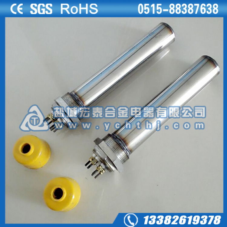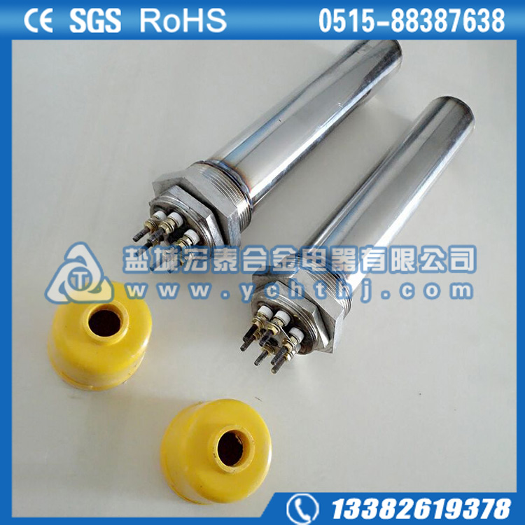 法兰电加热管(也称插入式电加热器):是采用U型管状电热元件,依据加热不同介质设计规范,按照功率配置要求装配在法兰盖上,插入需加热物料中,发热元件工作时所发出的大量热量传导给被加热介质使介质温度升高,达到所需的工艺要求。当介质温度达到工艺要求的设定值时,控制系统根据温度传感器信号,经PID运算后调节电加热器输出功率,对发热元件的电阻性负载实现温度控制。使介质温度均匀,达到所需要求;当发热元件超温或低液位时,发热元件的联锁保护装置立即切断加热电源避免发热元件烧坏,延长使用寿命。