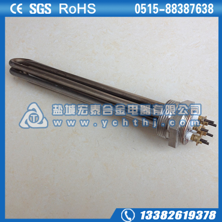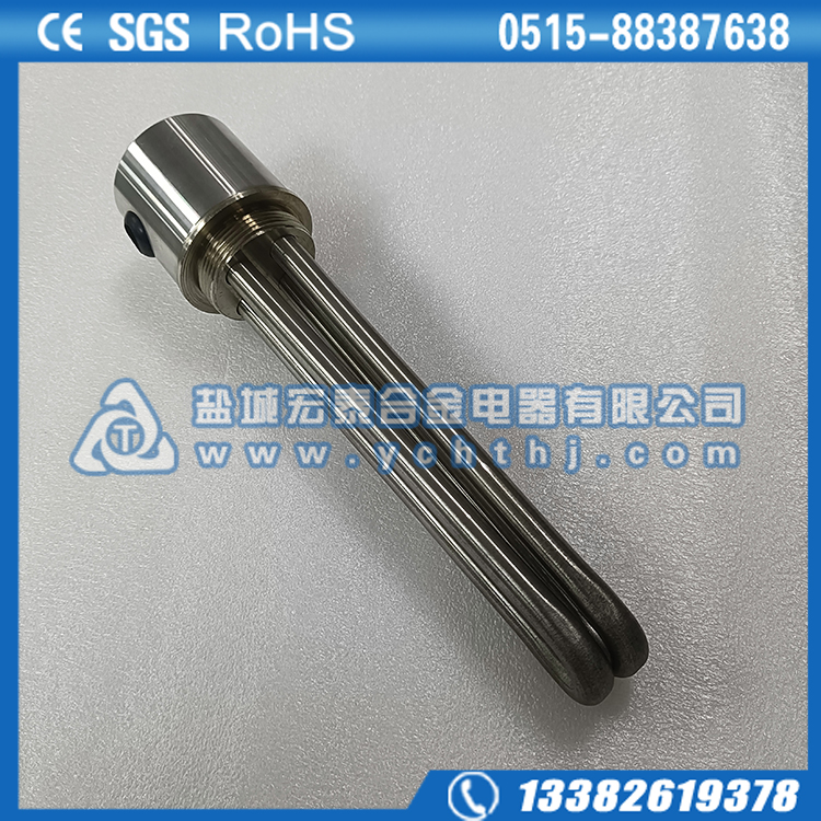 法兰电加热管(也称插入式电加热器):是采用U型管状电热元件,依据加热不同介质设计规范,按照功率配置要求装配在法兰盖上,插入需加热物料中,发热元件工作时所发出的大量热量传导给被加热介质使介质温度升高,达到所需的工艺要求。当介质温度达到工艺要求的设定值时,控制系统根据温度传感器信号,经PID运算后调节电加热器输出功率,对发热元件的电阻性负载实现温度控制。使介质温度均匀,达到所需要求;当发热元件超温或低液位时,发热元件的联锁保护装置立即切断加热电源避免发热元件烧坏,延长使用寿命。