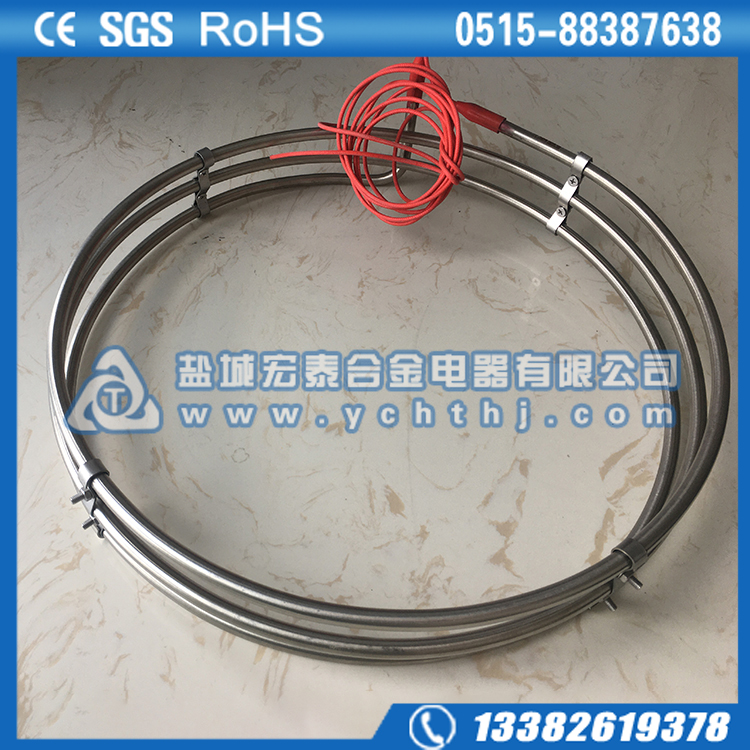 管状电热元件由金属管、螺旋状电阻丝及导热性好、绝缘性好的结晶氧化镁粉等组成。可以对系统进行加热的产品。电加热管选用优质国产厚壁无缝不锈钢管、美国进口高温氧化镁粉及封口材料,使电热管耐温达900℃,电热管在暂时脱水状态下干烧不会损坏;并采用气氛保护发黑网带炉经1060℃高温渗氮处理工艺,提高了电热管的耐高温和耐腐性,确保使用寿命 。加热管是在无缝金属管内(碳钢管、钛管、不锈钢管、铜管)装入电热丝,空隙部分填满有良好导热性和绝缘性的氧化镁粉后缩管而成,再加工成用户所需要的各种型状。它具有结构简单,热效率高,机械强度好,对恶劣的环境有良好的适应性。它可用于各种液体和酸碱盐的加热,同时也适应低溶点的金属加热溶化(铅、锌、锡、巴氏合金)