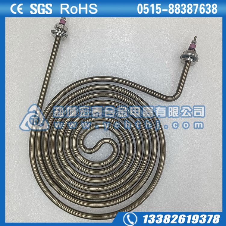 管状电热元件由金属管、螺旋状电阻丝及导热性好、绝缘性好的结晶氧化镁粉等组成。可以对系统进行加热的产品。电加热管选用优质国产厚壁无缝不锈钢管、美国进口高温氧化镁粉及封口材料,使电热管耐温达900℃,电热管在暂时脱水状态下干烧不会损坏;并采用气氛保护发黑网带炉经1060℃高温渗氮处理工艺,提高了电热管的耐高温和耐腐性,确保使用寿命 。加热管是在无缝金属管内(碳钢管、钛管、不锈钢管、铜管)装入电热丝,空隙部分填满有良好导热性和绝缘性的氧化镁粉后缩管而成,再加工成用户所需要的各种型状。它具有结构简单,热效率高,机械强度好,对恶劣的环境有良好的适应性。它可用于各种液体和酸碱盐的加热,同时也适应低溶点的金属加热溶化(铅、锌、锡、巴氏合金)